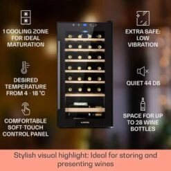 Experience the highest level of wine enjoyment with the Klarstein Shiraz 29 Duo wine refrigerator. With its two separate cooling zones, it gives both red and white wines the right drinking temperature at the same time. Thanks to the panoramic glass door and the LED interior lighting, you can keep a perfect view of the luxurious ambience and the up to 29 bottles at all times. Thanks to the convenient touch control as well as its elegant exterior, the Shiraz 29 Duo enriches every living ambience with comfort and elegance.