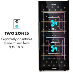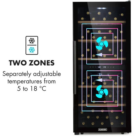 Always at the perfect temperature: Owing to two different cooling zones, you can always have the perfect wine at the right time with the Klarstein Barossa 102 Duo wine refrigerator. In the upper and lower temperature zones of the Klarstein Barossa 102 Duo wine cooler , up to 102 bottles of wine are cooled with pinpoint accuracy on five removable wooden shelves. The black glass front with panorama window made of safety glass ensures a stylish presentation of the wine treasures. The switchable interior lighting skilfully sets the scene for the bottles stored inside.