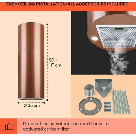 The external appearance of the Klarstein Beretta island extractor hood is absolutely elegant. The round copper-coloured housing made of stainless steel effortlessly gives your cooking island a stylish and luxurious shine.