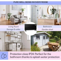 Early in the morning when brushing your teeth or after a bath, the body is enveloped with warmth, as the glass panel of the Klarstein Bornholms is splash-proof and can therefore be placed also in damp areas.