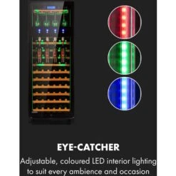 Visual aesthetics are also important for enjoyment: the lockable, tinted panoramic glass door with stainless steel frame ensures the skillful presentation of the wine stored inside. The switchable, coloured interior lighting also highlights the stored bottles to match the ambience. This makes the Klarstein First Class 84 wine dispenser a stylish visual highlight in bars or restaurants as well as for catered events or wine tastings.