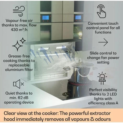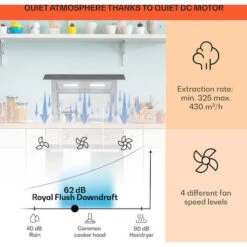 A STRONG FAN THAT NEVER DISTURBS: With a powerful 507m³/h airflow rate and 4 fan speeds, our cooker hood reduces odours and filters fumes for better air quality. It does this while operating quietly so you can cook alongside cooking videos.