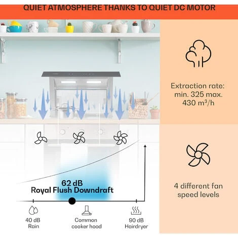 The Klarstein Royal Flush downdraft hood eliminates steam quickly without showing its hand: the retractable design with the high functionality is ideal for cooking islands in open kitchens, cooking surfaces in front of windows and retrofitting into existing kitchens. And with its first-class value for money, the Royal Flush is as valuable as a winning poker hand!