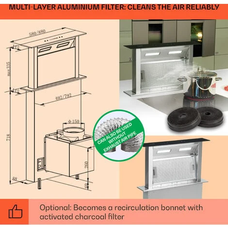 EXHAUST AND RECIRCULATION MODES: Not just an exhaust fan, it also doubles as a recirculating cooker hood. When switched to recirculation mode, carbon filters deftly trap odours and fumes. Note: activated carbon extractor fan filters sold separately.