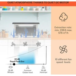 A STRONG FAN THAT NEVER DISTURBS: With a powerful 576m³/h airflow rate and 10 fan speeds, our 60cm cooker hood reduces odours and filters fumes for better air quality. It does this while operating quietly so you can cook alongside cooking videos.