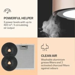 The external appearance of the Klarstein Skyfall Smart island extractor hood is absolutely stylish. The round housing made of brushed stainless steel with its brightly shining LED lighting gives your kitchen island an elegant shine.