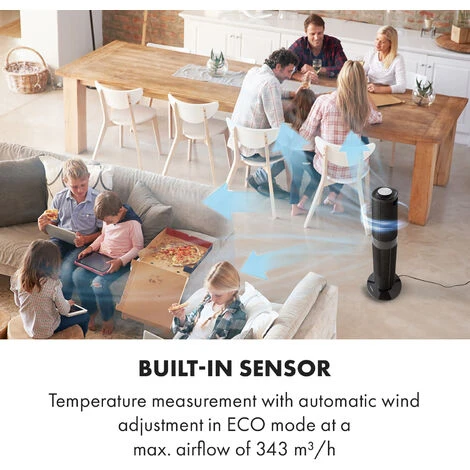 For precise cooling, the column fan is supported by a total of 3 speed levels with an airflow of up to 343 m³ / h. A switchable automatic oscillation ensures an even swiveling movement of the entire column at an angle of 80 °, while the upper half can be aligned manually within a radius of 360 °. In order to meet every meed, the device can be put into a natural, sleep or ECO mode for normal operation. While the natural mode provides a natural wind experience by varying the fan speed, the sleep mode favours gentle dozing with a fresh breeze by gradually lowering the ventilation speed. Using the built-in sensor, the ECO mode runs at temperatures below 25 ° C at low speed, between 25 ° C and 29 ° C at medium speed and above 29 ° C at high speed.