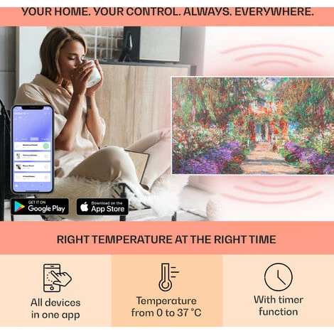 The Klarstein Wonderwall Air Art Smart infrared heater combines highly efficient heating power with attractive design and the latest technology. The 120 x 60 cm heating panel can be hung directly on the wall and is hardly larger than a framed picture. With its powerful 700 Watt output and owing to IR ComfortHeat it spreads very pleasant heat for the human skin without getting lost in the air. Owing to infrared technology, the heating panel is extremely energy-efficient and environmentally friendly, as a full 98 % of the power is converted into radiant heat. Smart functions for control via app, thermostat, auto switch-off function and IP44 protection class skilfully round off the innovation.